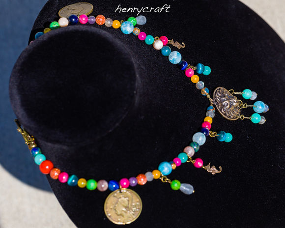 This custom jewelry includes an assortment of semi-precious stones, glass, and acrylic beads arranged in various color palettes and patterns. Metal finding options are bronze, gold plated, and silver-toned. Metal findings are dipped in "Protectaclear" to prevent tarnish in water.